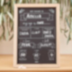 Musta liitutaulu vauvateemalla Botanical Baby -kokoelmasta. Tähän vanhemmat voivat täyttää erilaisia tärkeitä asioita lapsestaan. Taulu on noin 42 cm korkea ja 30 cm leveä, sekä ympäristöystävällinen. Pakkaus sisältää 3 kpl valkoisia liituja.