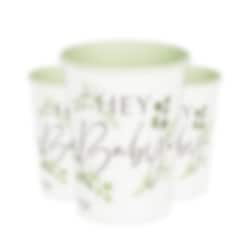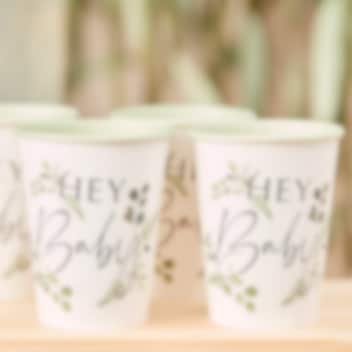 8 kpl valkoisen ja vihreän värisiä paperimukeja lehtikuvioilla ja tekstillä ''Hey Baby''. Hanki nämä täydentämään vauvajuhlien tai kastajaisten kattausta. Mukit ovat noin 10 cm korkeita ja niihin mahtuu noin 250 ml.