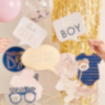 10 kpl valokuvarekvisiittaa kauniissa väreissä erilaisilla vauva-aiheilla. Sinä ja vieraasi voitte käyttää näitä ottaaksenne hauskoja kuvia Gender Reveal juhlien aikana.