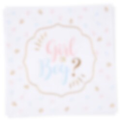 20 kpl suloisia servettejä tyylikkäillä yksityiskohdilla. Servetit ovat sinisiä ja vaaleanpunaisia, ja niissä on kultaisia folioyksityiskohtia sekä teksti "Girl or Boy?" keskellä.