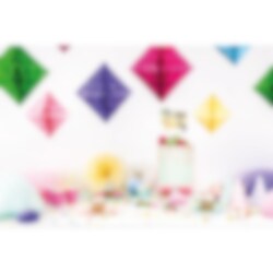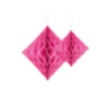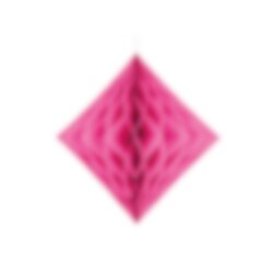 Tumman vaaleanpunainen timantinmuotoinen koriste, hunajakennokuvioista paperia. Helppo taitella kasaan kahksipuolisen teipin avulla. Ripustetaan mukana tulevan narun avulla. Koristetta on kahdessa eri koossa, 20 cm tai 30 cm. Hinta on yhdelle koristeelle.