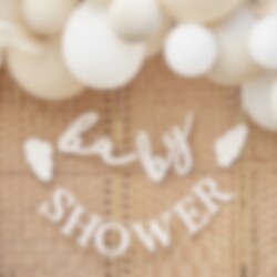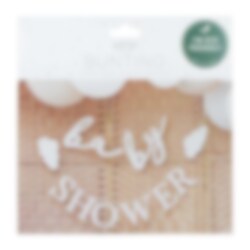 Söpö kermanvärinen kranssi "Baby" ja "Shower" -teksteillä. Ne kuuluvat tyylikkääseen Babyshower-mallistoon nimeltään Hello Baby. Viiri on kaksiosainen, sen toisessa osassa on sana "Baby" ja toisessa "Shower" sekä pieniä koristeellisia pilviä. Kumpikin osa on noin 1,5 metriä pitkä. Sekä tuote että pakkaus ovat ympäristöystävällisiä ja FSC-sertifioituja.