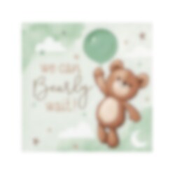 16 kpl pieniä servettejä, joissa on ilmapalloa pitelevä nallekarhu ja teksti ''we can bearly wait!'' Loistava babyshower-kutsuille. Serveteissä on 2 kerrosta ja ne ovat aukitaitettuina 25 x 25 cm.