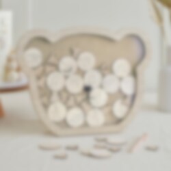 Teddykarhu-vieraskirja puukehyksessä – luova vaihtoehto tavalliselle vieraskirjalle. Sen lämmin väri ja puiset yksityiskohdat tekevät siitä täydellisen lahjan babyshowereille tai kastejuhlaan/nimiäisiin.