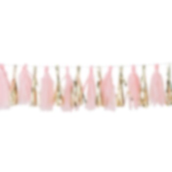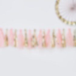 Suloinen köynnös, jossa on vaaleanpunaisia ja kullanvärisiä tupsuja. Kaunis koriste vauvakutsuille. Köynnöksessä on yhteensä 16 tupsua ja se on n. 2 metriä pitkä.