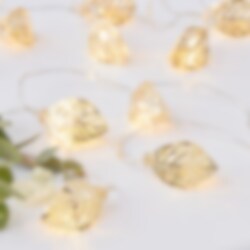 Kaunis viiri kultalehti-kuviolla, LED-valo. Suloinen koriste juhliin tai häihin. Viiri on n. 1,5 m pitkä ja toimii 2 kpl AA-paristoja (eivät sisälly).