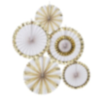 5 kpl kauniita koristeviuhkoja, joista 3 kpl on hieman suurempia ja 2 kpl hieman pienempiä. Viuhkat oat valkoisia ja niissä on kultafolioidut reunukset ja yksityiskohdat.