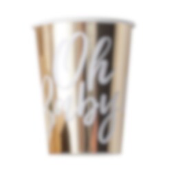 8 kpl kauniita kultafoliolla päällystettyjä pahvimukeja valkoisella tekstillä Oh Baby. Mukit ovat n. 10 cm korkeita ja tilavuudeltaan n. 270 ml.