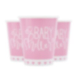 8 kpl vaaleanpunaisia, valkoreunaisia paperimukeja, joissa on valkoinen "Babyshower" teskti. Mukit ovat noin 10 cm korkeaita ja tilavuudeltaan n. 270 ml.