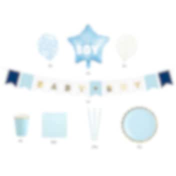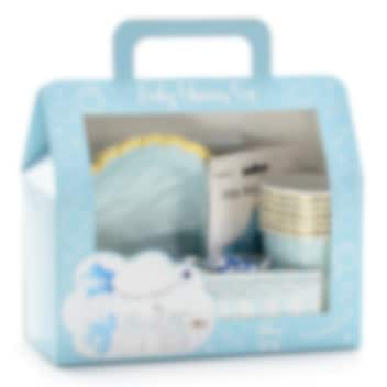 Valmis babyshower-paketti väreissä sininen, valkoinen ja kulta. Täydellinen kun haluat valmistella babyshowereihin mahdollisimman kätevästi.