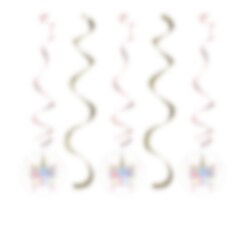 5 kpl roikkuvia koristeita, joista 3 kpl ruusukultaisilla kierteillä ja yksisarvisteemalla pastelliväreissä ja 2 kpl kultaisilla kierteillä. Todella hienot koristeet ripustettavaksi babyshower-juhliin yksisarvisteemalla. 3 koristeista on pituudeltaan 76 cm ja 2 pituudeltaan 99 cm.