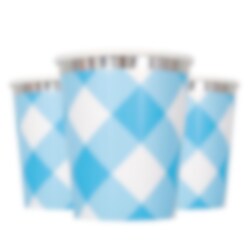 8 kpl pahvimukit sini-valkoisella ruutukuosilla ja hopeafolioiduilla reunoilla. Kaunis yksityiskohta synttärijuhliin. Mukit ovat noin 10 cm korkeita ja niihin mahtuu noin 270 ml.
