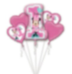 Söpö ilmapallokimppu Minni Hiiri -teemalla. Hauska koriste 1-vuotissyntymäpäiväjuhliin. Pakkaus sisältää yhden ykkösen muotoisen ilmapallon (48 x 71 cm) ja 4 sydämen muotoista ilmapalloa (43 cm).