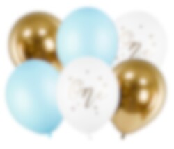 Hieno 1-vuotisteemainen ilmapallokimppu kauniissa väreissä. Koristele 1-vuotisjuhlien huone tällä upean sisustuksen luomiseksi. Pakkaus sisältää 2 kultaista, 2 vaaleansinistä ja 2 valkoista folioilmapalloa, joissa on teksti "One" sekä kultaisia tähtiä. Kaikkien ilmapallojen halkaisija on noin 30cm, ja ne on täytettävissä heliumilla tai tavallisella ilmalla. Suosittelemme ilmapallopumpun käyttöä.
