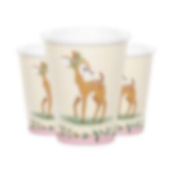 8 paperimukia suloissa väreissä peuran ja oksien kuvilla. Hieno lisä Deer Little One -teemaisiin juhliin. Mukit ovat noin 10 cm korkeita ja niihin mahtuu noin 256 ml.