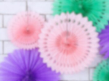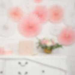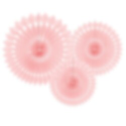 3 kpl kauniita vaaleanpunaisia koristeviuhkoja. Helppo koota ja ripustaa. Luo tunnelmaa synttäreille, juhliin, ristiäisiin, babyshower-juhliin ja muihin tilaisuuksiin. Pakkaus sisältää 3 kpl viuhkoja, jotka ovat läpimitaltaan 40 cm, 32 cm ja 23 cm. Valmistettu paperista.