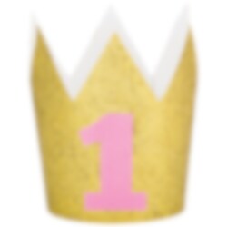 Kruunua esittävä synttärihattu kultaisella glitterillä ja pinkillä numero ykkösellä. Synttärisankari voi käyttää tätä hienoa kruunua 1-vuotis juhlissa. Kruunun korkeus on noin 10 cm ja se pysyy paikallaan kuminauhan avulla.