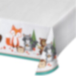 Suuri muovinen pöytäliina ihanilla väreillä ja upealla Woodland Animals -teemalla, jossa eläimiä ja metsää. Täydellinen lisä syntymäpäivillesi eläintemmalla. Pöytäliina on noin 137 x 259 cm kokoinen.