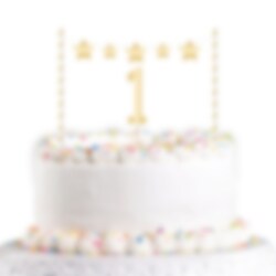 Kultainen kakkukoriste, joka sopii täydellisesti 1-vuotiaan syntymäpäiväkakun koristeeksi. Pakkaus sisältää 2kpl kultavalkoraidallista pahvipilliä sekä kultaisilla tähdillä koristellun seppeleen.