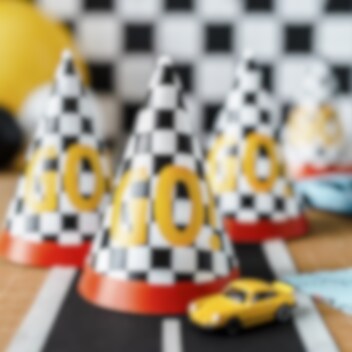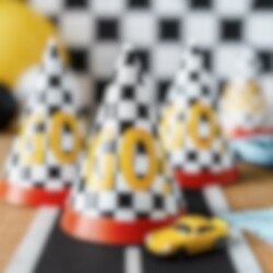 6 kpl. juhlahattuja kilpa-autoteemalla, joissa on hienoja kuvia autokilpailujen maalilipusta. Hatut ovat 16 cm korkeita ja ne pysyy paikallaan joustavalla kuminauhalla.