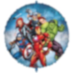 Pyöreä sininen folioilmapallo, jossa on Avengers-sankarien kuva molemmin puolin. Hauskaa koriste juhliisi.