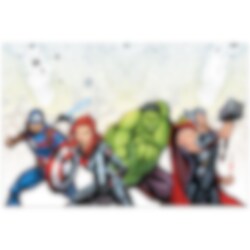 Todella hieno muovinen pöytäliina Avengers-supersankareiden kuvalla. Sopii täydellisesti Avengers-juhliin. Pöytäliinan koko on noin 120 x 180 cm.