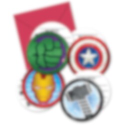 6 kpl pyöreitä kutsukortteja, joissa on neljä erilaista designaihetta sarjasta Avengers. Kortit ovat 12 cm läpimitaltaan ja kaikki tekstit ovat englanniksi. Pakkaus sisältää myös 6 kpl punaisia kirjekuoria.