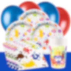 Valmis juhlasetti sisältää lautaset (23 cm), paperimukit (250 ml) ja servetit (33 x 33 cm) 8:lle tai 16:lle henkilölle. Tämän lisäksi pakkauksessa on 10 kpl tummansinisiä ja 10 kpl punaisia ilmapalloja sekä tummansininen muovinen pöytäliina ( 137 x 274 cm).
