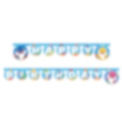 Sininen pahviköynnös, jonka teemana on Baby Shark ja tämän perhe sekä valkoinen "Happy Birthday"-teksti. Ripusta koriste seinälle tai oven ylle juhlia varten, kun synttäreiden teemana on Baby Shark. Köynnös on noin 2 metriä pitkä.