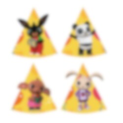 8 kpl. juhlahatut, joissa on söpö kuvio Bing-sarjan eri hahmoista. Hatut ovat noin 16 cm korkeita ja ne pidetään paikoillaan kuminauhalla.