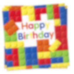 Tee värikäs kattaus lastenjuhliin näillä rakennuspalikka-serveteillä. Teksti "Happy Birthday" – sopii täydellisesti pienten rakennusfanien syntymäpäiväjuhliin. Servetit ovat 2-kerroksisia ja 33 × 33 cm kokoisia avattuna.