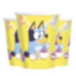8 kpl. pahvimukeja kauniilla Bluey-kuviolla. Mukit ovat noin 10 cm korkeita ja niiden tilavuus on noin 270 ml.