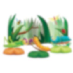 Nämä värikkäät 3D-pöytäkoristeet pahvista hunajakennopohjalla luovat leikkisän ja luonnon inspiroiman juhlakattauksen. Sarja sisältää 4 osaa: tausta (30 x 69 cm), kovakuoriainen (17,6 x 23 cm), heinäsirkka (18,7 x 24,3 cm) ja toukka (22,6 x 25 cm). Tuo luonnon pienet ötökät juhliin!