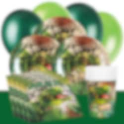 Tämä dinosaurusaiheinen juhlasetti sisältää lautaset (22,5 cm), pahvimukit (270 ml) ja servetit (33 x 33 cm) 10 tai 20 hengelle. Pakkauksessa on lisäksi 10 vaaleanvihreää ja 10 tummanvihreää ilmapalloa sekä tummanvihreä muovinen pöytäliina (137 x 274 cm).