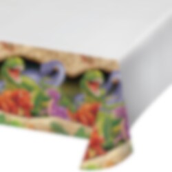 Suuri, värikäs pöytäliina kuvilla dinosauruksista, joka on osa siistiä dinosaurus-teemaamme. Pöytäliina viimeistelee synttärikattauksen, ja suojaa pöytää turhalta sotkulta. Pöytäliina on valmistettu muovista ja se on noin 137 * 274 cm kokoinen.