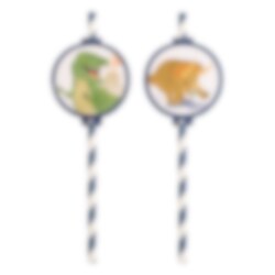 8 kpl valkosiniraidallisia pahvipillejä dinosaurusteemalla. Huippu tarvike pöytäkattaukseen ennen dinosaurussynttäreitä. Pillien pituus on noin 19 cm ja kuva-aiheen halkaisija on noin 6,5 cm.