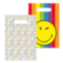 8 kpl paperisia juhlapusseja, joiden toisella puolella on silmää iskevä hymiö sateenkaaren värisellä taustalla ja toisella puolella värikkäitä hymiöitä valkoisella taustalla.Täytä pussit makeisilla ja leluilla ja anna sitten lahjaksi syntymäpäiväjuhlien vieraille.