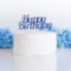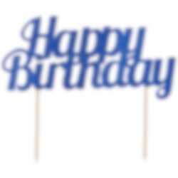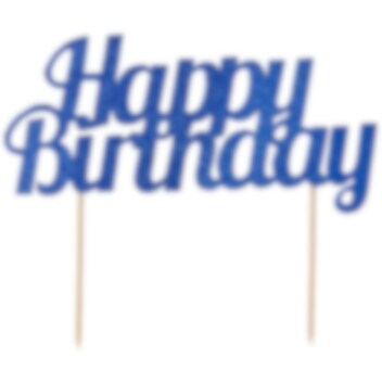 Kimalteleva sininen kakkukoriste ”Happy Birthday”-tekstillä. Koristele kakku tällä synttäreitä varten, jotta kakku olisi mahdollisimman tyylikäs. Koriste on noin 10 x 14 cm kokoinen.