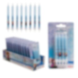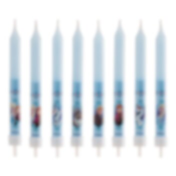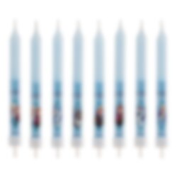 8 kpl vaaleansinisiä kakkukynttilöitä Frozen-synttäreille. Kynttilöiden korkeus on n. 9 cm.