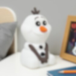 Anna hurmaavan lumiukko Olafin valaista huonetta. Tämä 15 cm korkea silikoninen yölamppu esittää Olafia Frozenista ja luo miellyttävää valkoista valoa. Lampussa on älykäs sammutustoiminto, joka sammuttaa sen automaattisesti 1-3 tunnin kuluttua. Säädä kirkkautta helposti painamalla päätä.