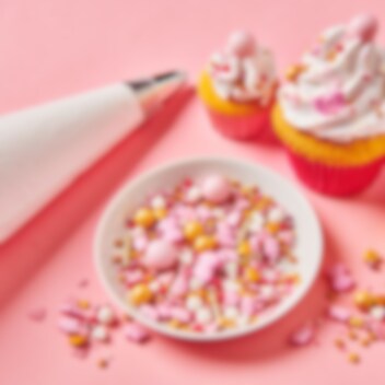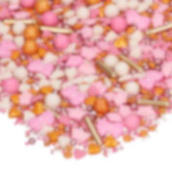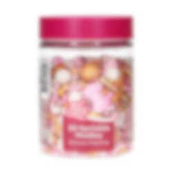 Anna leivonnaisillesi taianomainen silaus tällä lumoavalla strösselillä! Tämä eksklusiivinen sekoitus yhdistää kimaltelevat helmet, suloiset sydämet ja leikkisät 3D-hahmot vaaleanpunaisen, valkoisen ja kultaisen sävyissä. Täydellinen koristamaan kuppikakkuja, kakkuja ja leivoksia prinsessajuhliin tai muihin juhlatilaisuuksiin.