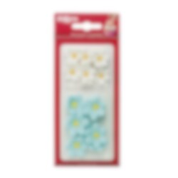14 kaunista kukkaa, joissa on sekoitus sinisiä ja valkoisia sävyjä sekä keltaiset keskikohdat. Täydellisiä elegantin koristelun luomiseeen kuppikakuille, kakuille ja muille leivonnaisille.
