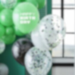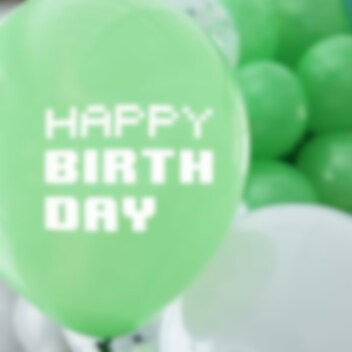 5 kpl kauniin värisiä lateksi-ilmapalloja, joista yhtä koristaa "Happy Birthday" -teksti, kahdessa on peliohjain-kuvio ja kaksi muuta on täytetty värikkäillä konfeteilla.