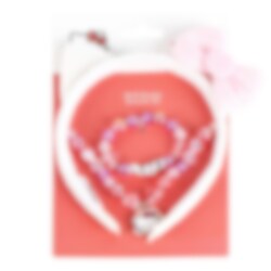 Tuo asuun asennetta tällä tyylikkäällä Kuromi-korusetillä! Setti sisältää kimaltelevan diadeemin kissankorvilla, vaaleanpunavalkoisen helmikorun, jossa on teksti "LOVE", sekä yhteensopivan kaulakorun, jossa on söpö Kuromi-riipus. Täydellinen asuste pienille Hello Kitty -universumin faneille, jotka haluavat erottua joukosta!