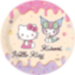 8 värikästä lautasta, joissa on Hello Kittyn ja Kuromin kuva. Täydellisiä luomaan söpön ja leikkisän kattauksen juhliin. Pastellivärit ja juhlavat yksityiskohdat jäätelön ja strösselin kanssa tekevät lautasista todellisen katseenvangitsijan pöydällä.