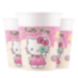 8 kpl pahvimukit, joissa on Hello Kittyn ja Kuromin kuva. Suloinen ja leikkisä yksityiskohta, joka tekee kattauksesta erityisen juhlavan. Pastellinväriset jäätelöteemaiset mukit sopivat täydellisesti mehun, limsan tai muiden juhlajuomien tarjoiluun.