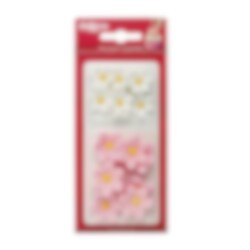 14 yksityiskohtaista kukkaa. Sekoitus vaaleanpunaisia ja valkoisia sävyjä keltaisilla keskustoilla – täydellisiä elegantin koristuksen luomiseen kuppikakkuihin, kakkuihin ja muihin leivonnaisiin.