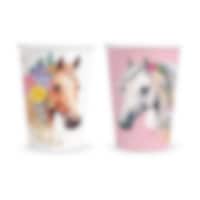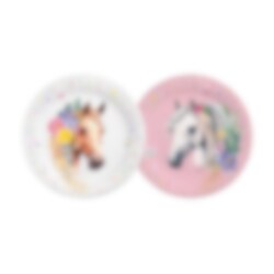 Kata kauniit hevossynttärijuhlat näillä viehättävillä pahvilautasilla, joissa on kauniita hevoskuvia. Lautasissa on kaksi erilaista, pehmeäsävyistä kuosia, toinen valkoisella hevosella ja toinen ruskealla hevosella, molemmat koristeltuina kukilla, mikä antaa kattaukselle unenomaisen ja leikkisän tunnelman.