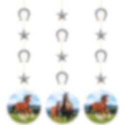 3 kpl riippuvia koristeita, joissa kuvat tähdistä, hevosenkengistä ja söpöistä hevosista. Koristele juhlahuone ja saat lisätunnelmaa heppa-aiheisiin juhliin. Koristeet ovat n. 91 cm pitkiä ja kuvat hevosilla n. 18 cm halkaisijaltaan.