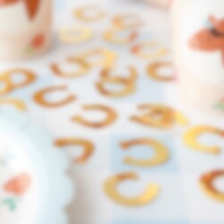 Kaunis kultafolio-konfetti, joka esittää hevosenkenkiä. Konfetit ovat 2 cm halkaisijaltaan. Pussi sisältää 15 grammaa.